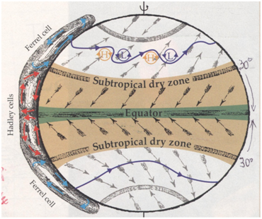 Figure 3 Pictured are the global air circulations: in the Hadley cells (red arrows) over the two equatorial areas and in the Ferrell cells (blue arrows) over the adjacent zones of 300 to 600 north and south of the equator, in which the air circulates in opposite direction.