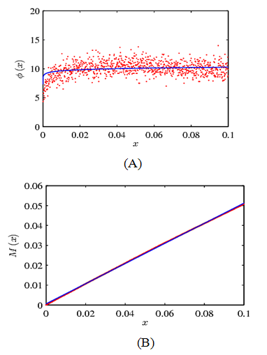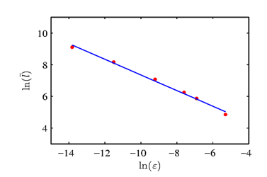 From Table 1, we have found and then the theoretical evaluation for the characteristic relation exponent, given by Eq. (14), is To verify this exponent, we calculate for the tests included in Table 1. The results are exposed in Figure 4, which shows the numerical characteristic relation for the map (9). Red points are the numerical data, and the blue line is its linear interpolation. The slope of this straight line is approximately -0.495, which is very close to the theoretical exponent predicted using the M function methodology.4,25 Another consequence of the previous Theorem is that the traditional values of the characteristic relation exponent,can be obtained not only for uniform reinjection but also for any RPD holding the conditions (1) and (2). Figure 4 shows this behavior. Therefore, the test studied in this subsection does not have a uniform RPD, but its characteristic relation is equal to those obtained with uniform reinjection.