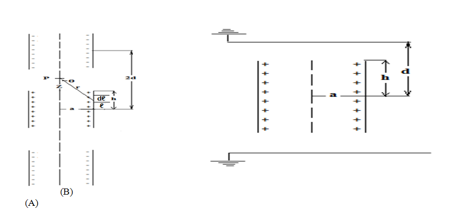 Consider a cylindrical electrode with inner radius, a, and length, 2h, is placed between two electrodes such that the distance between the center of the cylinder and any of the two plane electrodes is, d, as shown in Figure 1A. Assume a charge of density ρ is produced on the inner surface of the cylinder due to applied potential, V, on it. The electric field intensity and potential at any point on the symmetrical axis, Z, can be obtained by applying the image theory.14 Figure 1B shows a cylindrical electrode of charge density