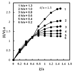 Figure 3The distribution of (E/V).a along the symmetrical axis at different values of h for d/a=2.