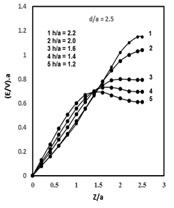 Figure 4The distribution of (E/V).a along the symmetrical axis at different values of h for d/a=2.5.