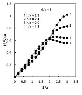 Figure 5The distribution of (E/V).a along the symmetrical axis at different values of h for d/a=3.
