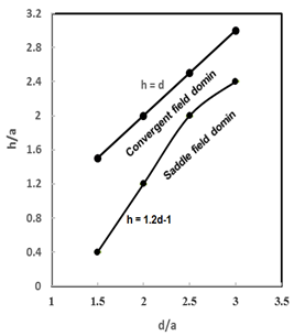 Figure 6 shows the two-different d - h domains from d/a = 1.5 to d/a = 3 for saddle field and convergent field types. Figure 7 represents the relation of