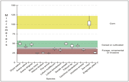 Figure 6 Box Plot of sizes of pollen grains of non-native Poaceae species from Rio Grande do Sul highlighting the pollen groups. The bold horizontal line within the box represents the median. The box shows 50% of the interquartile range, and whiskers the total variation. The marked region (xxx) shows overlap between sizes of pollen grains.