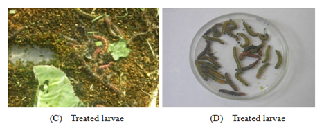The larvae went 2-3inch down in the sand and pupated. After two days of pupation, the pupae were taken out from the sand, cleaned with cotton and kept in separate jars for emergence. As soon as the moths emerged they were transferred to other rearing jars to maintain a large population of all stages throughout the year at the controlled condition. From this stock culture, newly moulted 5th instar larvae were sorted out and kept in separate breeding jars for further experimental purposes. In the present study 24hrs old 5th instar larvae were used for the experiments. The samples of newly moulted 4th instar larvae Spodoptera litura between 10:00am and 12:00 noon each day were isolated and maintained age-wise. Subsequently, fresh moulted 5th instar larvae were treated with different concentrations of spinosad and deltamethrin. Likewise, the 4th instar larvae of Spodoptera litura were also sorted out from the random culture and maintained in separate rearing jars. As soon as they moulted to 5th instar which can be visually ascertained by the size, head capsule and exuviae they were treated with varying concentrations.
