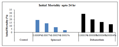 The topical application of four selected sub lethal concentrations of spinosad viz., 0.0009, 0.0007, 0.0005 and 0.0001% on 24 hrs old 5th instar larvae of Spodoptera litura gave varied mortality and increased with increasing sub lethal concentrations of spinosad viz., 0.0009, 0.0007, 0.0005 and 0.0001% on 24 hrs old 5th instar larvae of Euproctislunata and Spodopteralituragave varied mortality and increased with increasing sub lethal concentrations. The effect of the above said concentrations either on initial mortality with in 24 hour or up to adult emergence was more pronounced when the application was made on 5th instar larvae of Euproctislunata as compared to the 5th instar larvae of Spodopteralitura. The initial mortality following the topical application of the highest selected sub lethal concentration (i.e. 0.0009%) of spinosad in case of E. Lunata was 20.67% more as compared to S. Litura, whereas, the lowest selected concentration (i.e. 0.0001%) showed 11.33% more larval death in case of Spodoptera litura compared to S. Litura. Likewise the total mortality of larvae up to adult emergence following the exposure of highest (0.0009%) and lowest (0.0001%) selected concentrations of spinosad to 5th instar larvae of S. Litura. Likewise the topical application of four different selected sub lethal concentrations of deltamethrin viz., 0.00004, 0.00006, 0.00008 and 0.0001% on 24 hrs old 5th instars larvae of Spodoptera litura also gave varied mortality and increased with increasing sub lethal concentrations (Figure 14).