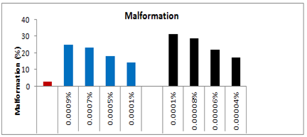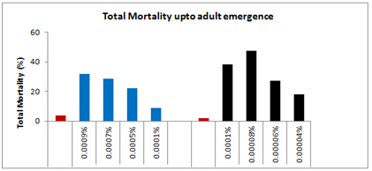 In the third set, topical application of 0.00006% Deltamethrin resulted 16% mortality within the same instar, whereas 9% larvae died during the next larval stage and 2.33% larvae died due to incomplete pupal-adult emergence. The total loss up to adult emergence was 25.33% more than the control-I. The adults which emerged from the survived treated larvae had 22% malformation in their wings or legs. The larval duration of the treated 5th instar was enhanced by 28.57%, whereas, the survival duration of 6th instar was increased by 25%. Likewise, the longevity of the adult males as well as adults females also increased by 38.97 and 10.39% respectively as compared to control-I. In the fourth set of 25 larvae that topically treated with 0.00008% concentration of deltamethrin, the immediate mortality was 20% during 24hrs followed by 13.33% during the next instar. Out of the survived larvae again 8.3% lost their live during pupal formation 5.7% could emerge as adult, resulting thereby a total loss of 47.33% which was 45.33% more as compared to control-I (Figure 10).