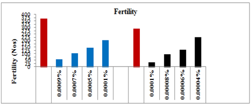 The adults which emerged from the survived treated larvae had no effect on their behavior and were as competitive as those of controls. The newly emerged affected males were paired with females of same age of the same set to observe fecundity and fertility. The average egg production of the females that emerged from the survived treated 5th instar larvae decreased linearly with increasing concentrations of spinosad (Y=–67.49x+489.1, R2=0.949, P≥0.001) showing a negative correlation coefficient (Figure 5). After the application of the lower selected sub lethal concentrations (0.0001 and 0.0005%) of spinosad, the average fecundity of the females reduced significantly by 32.06% (t=10.383, P≥0.05) and 48.18% (t=14.473, P≥0.05), respectively, as compared to the control. Whereas on application of the higher sub lethal concentrations, i.e. 0.0007 and 0.0009% spinosad on the larvae, the average egg production by the females dropped significantly by 62.13% (t=15.847, P≥0.05) and 72.70% (t=11.111, P≥0.05), respectively, as compared to control-I. Likewise, the fertility of the eggs laid by the affected females also decreased linearly and showed negative correlation (Y= –72.06x+464.4, R2=0.900, P≥0.001). The hatchability of the eggs after the application of lower doses dropped significantly by 21.93% (t=12.789, P≥0.05) and 26.09% (t=19.974, P≥0.05), respectively, as compared to control-I. Whereas on the application of the higher selected sub lethal doses i.e. 0.0007% and 0.0009%, the fertility of the eggs dropped significantly by 29.06% (t=13.332, P≥0.05) and 44.76% (t=14.551, P≥0.05), respectively, as compared to control-I (Figure 6).