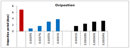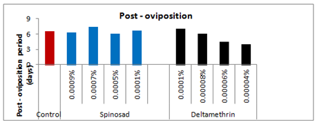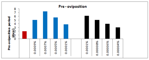 The pre-oviposition period of the affected females emerged from the treated larvae with 0.0001%, 0.0005%, 0.0007% and 0.0009% concentrations of spinosad was recorded as 3.83(t=2.200), 5.66(t=3.617), 7.33(t=4.880) and 5.00(t=1.078) days respectively as compared to 2.00days in case of control (Figure 7). Thus, the overall increase in the pre-oviposition period of the affected females was 47.78%, 64.66%, 72.71% and 60% respectively as compared to control-I. Likewise, the post-oviposition period of the affected females that emerged from the survived treated larvae with respect to the above said concentrations was 6.66(t=0.229), 6.00(t=1.000), 7.33(t=1.387) and 6.33(t=0.053) days as compared to 6.5days in case of control which was 2.4% more, 8.33% less, 11.32 more and 2.69% less more as compared to control. On the other hand the oviposition period of the affected females with respect to the above said concentrations was reduced by 43.92, 56.08, 75.69, and 87.85% respectively as compared to control and recorded as 3.83(t=3.928), 3.00(t=8.693), 1.66(t=11.717) and 0.83(t=5.196) days respectively as compared to control i.e. 6.83days.