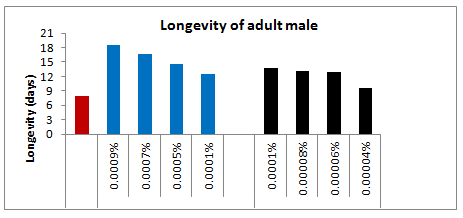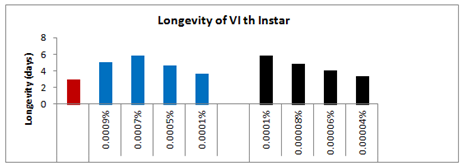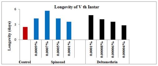 In the third set, topical application of 0.0005% spinosad resulted 8% larval loss within the same instar, whereas 6% larvae died during the next larval stage and 03% died due incomplete larval-pupal transformation and 05% could not emerged successfully from the pupae and succumbed at during pupal-adult emergence. The total loss up to adult emergence was 22% which was 18% more than the control-I. Out of the total adults, 18% had malformed wings. The longevity of the survived 5th and 6th instar larvae was enhanced by 39.90% and 35.62% respectively, whereas, the survival duration of adult males and adult females was increased by 46% and 33.33% respectively as compared to control-I (Figure 3). In the fourth set of 25 larvae treated with 0.0007% concentration of spinosad, the immediate larval mortality within 24 hrs was 14%, however, 7.33% larvae died during the ensuing instar followed by 3% during the larval-pupal transformation and 4.33% during the adult emergence, leading to a total mortality of 28.66% up to adult emergence. The larvae which survived the treatment were quite active like those of control. However, out of adults who emerged from the survived larvae, 23.33% had malformed wings.