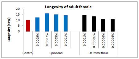 Figure 15: Longevity of adult female emerged from 5th instar treated larvae of Spodoptera litura following topical application of Spinosad and Deltamethrin.