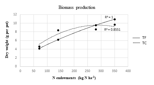 Figure 1 Second degree polynomial curves for biomass production as a function of N endowments in the mixed fertilizers.