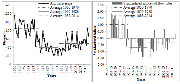 In this article, the fluvial flow of period 1951-2014 was divided into three series of which two on the pre-impact period of dam (1951-1970 and 1970-1988 respectively representing the flow in wet and dry natural conditions) and one on the post-impact period of dam (1988-2014) under controlled conditions. Over these two pre-impact and post-impact periods, the characteristics of the hydrological regime were examined using the IHA/RVA method. The IHA (Indicators of Hydrologic Alteration) method developed by The Nature Conservancy3 has been used to assess hydrological features primarily associated with downstream dams5 and alteration of the hydrological regime of rivers. This model calculates 33 ecologically relevant hydrological parameters that describe the hydrological regime and are grouped into 5 categories.3 (i) amplitude, (ii) amplitude and duration of annual extreme conditions, (iii) periodicity of these extreme annual conditions, (iv) frequency and duration of high and low pulsations, (v) rate and frequency of flow variations.