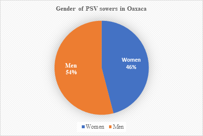 In rural Oaxaca, as in other states of the country, the participation of women in primary activities such as agriculture has increased little by little over time. The results obtained in the survey indicate that the participation of women in the PSV was 45.96% and 54.04% corresponded to men (Figure 2); which is extremely interesting due to the fact that, in this state, the female sex has a large percentage of presence in the agricultural sector.