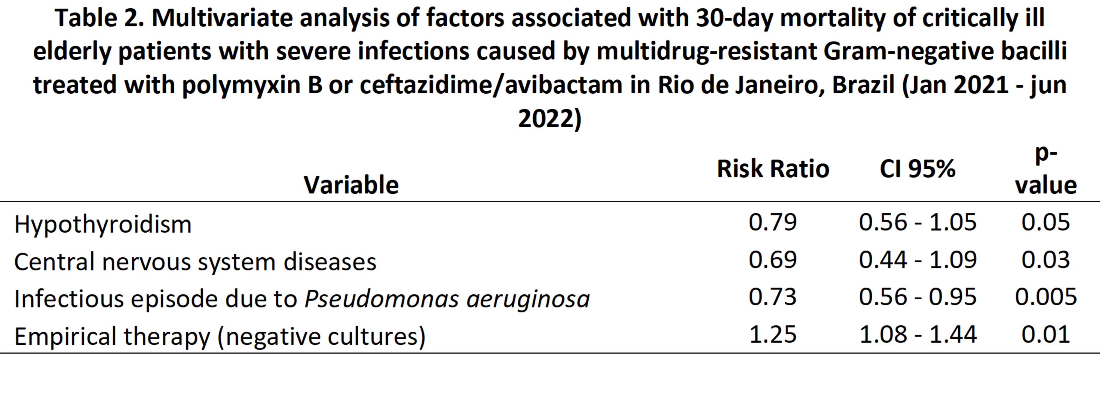 Several studies have shown therapeutic failure in the use of these new associations due to problems related to bacterial resistance22,23 and related to adverse effects in therapy.24 The aim of this study was to evaluate the 30-day mortality in critically ill elderly patients with infections caused by CR-GNB who were treated with CAZ/AVI or PB. In addition, a study was conducted to determine the economic impact of the use of these antimicrobial therapies on this patient population.