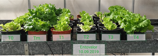 The present case study is based on a pot experiment with lettuce (Lactuca sativa L. var. Crispa) in Haplic Fluvisol (ISSS-ISRIC-FAO, 2006) mixed with perlite, in a proportion of 4:1 respectively, and fertilized with a biodigested by the larvae of the black soldier fly (BSFL) - opportunely reported.4 The mineral fertilizer used was Foskasuper®, considering 100% of the expected N requirement. Entomocompost was produced by Entogreen® and resulted from the black soldier fly larvae (BSFL) digestion of agro-industrial by-products (from potato and onion), without any stabilizers or preservatives added, and in accordance with the Portuguese legislation.6 The treatments, with five replications, were as follows: T0, control without fertilization; TM, mineral (100% N); T50, organic (50% N); T100, organic (100% N); T150, organic (150% N); and Tmix, mixed (100% N - 33.3% mineral N plus 66.6% organic N). The results assessed for the aerial biomass fresh weight and dry weight production per pot did not reveal any statistical significance between TM (162.5 g) and Tmix (144.5 g), which differed by a statistically significant margin from the remaining treatments (21.2 g). The vegetative aspect verified for the different treatments, immediately before the harvesting of the aerial part, was that shown in Figure 1.