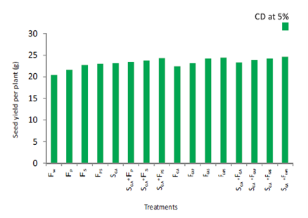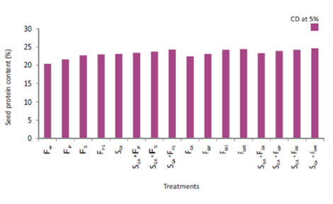 Treatment SGA+FGAPS gave the maximum value for pod number per plant. Its effect was, however, equal to that of SGA+FGAS. Treatment SGA+FGAPS gave 121.72% higher value than FW (Table 7). Treatment SGA+FGAPS gave the maximum value of seed yield. Its effect was, however, equal to that of SGA+FGAS, SGA+FGAP and SGA+FGA. Treatment SGA+FGAPS gave 86.14% higher value than FW (Figure 1). Treatment SGA+FGAPS proved best for HI. Its effect was, however, equal to that of SGA+FGAS, FGAPS, SGA+FGAP, SGA+FPS and FGAP. Treatment SGA+FGAPS gave 91.78% higher value than FW (Table 7). Treatment SGA+FGAPS gave the maximum value for quality parameters viz., seed protein and carbohydrate content. Its effect was, however, equal to that of FGAPS, FGA, SGA+FGA, SGA+FGAS, FGAS, SGA+FGAP, SGA+FS, SGA+FP, FGAP, SGA and FPS. Treatment SGA+FGAPS gave 20.59% and 11% higher value than FW respectively (Figure 2 & Table 8). The increase in the number of pods per plant and 100-seed weight resulting from the foliar application of GA in comparison with the water-sprayed control of chickpea cultivar DCP 92-3 receiving the recommended basal dose of N and P in is worth mentioning. The increase in the above yield attributes may be traced to its various roles mentioned earlier leading to observed higher values for growth characters and, physiological and biochemical parameters of treated plants.