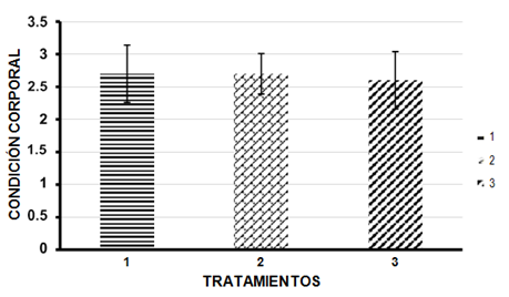 The rate of pregnancy of cows Bos taurus/Bos indicus, was 33.1% (53/150) for the 3 treatments and treatment (1, 2 and 3) was 18.75, 48.27 and 31.3% respectively. Presenting significant difference (P< 0.05) among treatments (Table 1). The fact to have found significant differences between synchronization protocols indicates that treatment 2 a base of DIB® and 3 with PROCICLAR® are better that 1 a treatment base CIDR® for estrus synchronization in dual purpose cattle Bos taurus/Bos indicus. Comparing the results obtained in this study it was observed that treatment 1 with CIDR-B® showed a rate of gestation less than that found by Auzmendi et al.,2 who use CIDR-B® + 1 mg of BE, noting the 32.1% of gestation, while using DIB®+0.5 mg of EC found the 23.7%. In contrast, Gutierrez et al.,3 obtained a 75 and 40% of pregnancy in calves by using device CRESTAR® and DIB® respectively, which is superior to that found in this study. In this regard, Perez (2007) obtained a 54.8% of gestation in heifers using devices CIDR® new. While Flores et al.,4 obtained a 56.5% of gestation using CIDR® + BE and 47.8% using CIDR® + GnRH. In regards to variable body condition evaluated in this study, significant between treatments on the pregnancy rate was found (P> 0.05, Table 1 and (Figure 1). In support of these findings, Gastelum, (1998) evaluated body condition on conception rate and got no significant differences for a body condition of the cows postpartum of 2.5, 3 and 3.5 with 47, 53 and 62% gestation rate respectively.