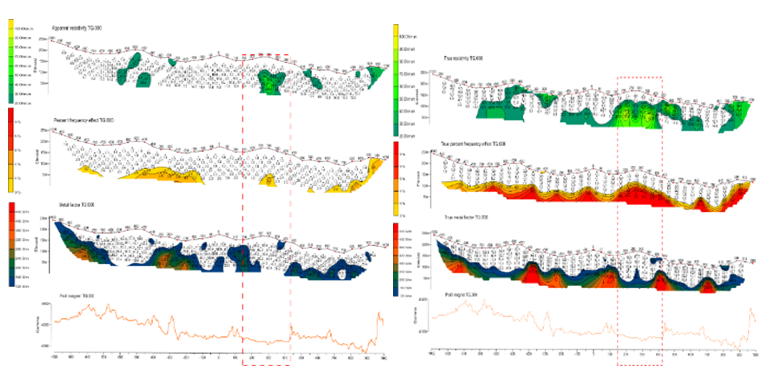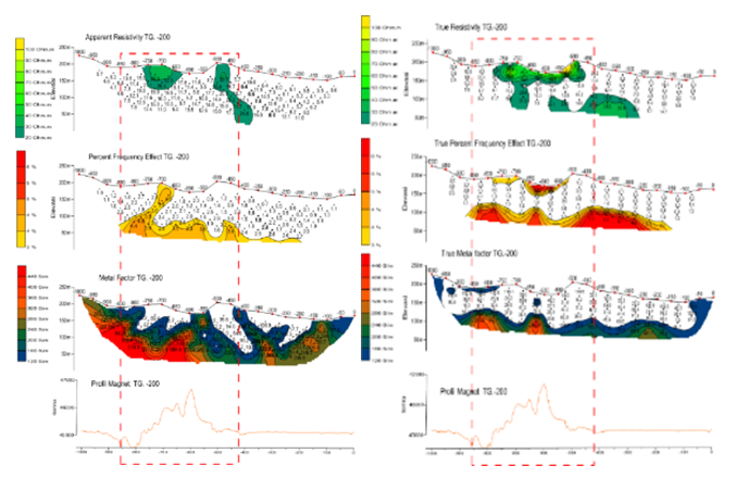 Line TG.000 is where outcrops have been found. It shows induction polarization anomaly but did not lead to mineralization. For interest zone line TG.-200 show high value PFE and indication of lineal shaped intrusion which can lead to mineralization. At point -1000 to 0 is sandstone which implied by breccia andesite at point 850 to -750. Unfortunately, that mineralization did not associated with gold mineral, but others.