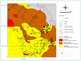 Mostly, lithology of Village TG is mix between sandstone-silt and breccia-andesite with layering at 160 degrees at north side to 190 degrees at east side. Breccia andesite is a graduation from volcanic breccia andesite clastic to sediment. At under part, it looks andesite more dominantly as a layering creation with slope to east-south side. This layering have non-distinct border. It has interpreted as clastic volcanic-pyroclastic rocks that have phase transition to be turbidity-sandstone. Turbidity-sandstone is sediment that has precipitate by turbidity current mechanism. Turbidity current has higher viscosity than hydrothermal liquid (Keunen and Migliorini, 1950). For silt-sandstone is a mix between slit, sandstone and clay with material substance such as clays, feldspar, fossil, and few fragment of rocks. At some point, it has been silicification and there is pyrite dissemination 1% with spread of dense non-rule vein calcite. It is shown that silt has been silicification and more brittle than sandstone. For andesite layer as lava and sill with mineral mafic such as hornblende. Andesite layer has been predicting as volcanism product of Pleistocene era and as part of volcanic arrangement Mandirancan and Kebasen (East River Serayu). This layer has not been alteration and interpreted as part of mineralization agent.