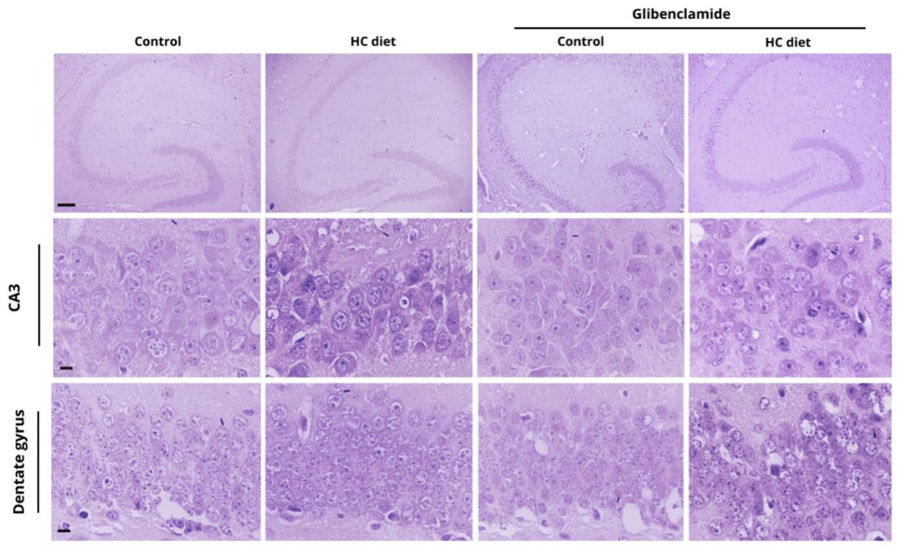 Figure 5 Hippocampal CA1 and CA2 regions in mice brain treated with different diets and in the presence or absence of glibenclamide. Scale bars equal 600 μm (hippocampus); 200 μm (CA1 and CA2).