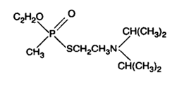 V nerve agents (VX, VR-55, Goman, TGD) are colorless and odorless. After contact with the body, mixing into the blood takes place in very short periods, such as 1-2 minutes. Its lethal effect is much higher compared to other nerve agents. Their volatility is low, so they can stay in their place for a long time without evaporation. They can stay for weeks without freezing in cold weather as their freezing temperatures are low. Even in very small quantities (one drop), they show their effects quickly, such as vomiting, sweating, and dizziness. They are used as aerosol in order to penetrate the body both through respiratory and skin contact.VX is the deadliest among chemical agents that affect the nerve system. VX, which is in liquid form under room conditions, is colorless and odorless. The mechanism of action on the body is similar to sarine. Due to its low volatility, it can remain effective for a long time where it is used. It is much more lethal than Sarin. When penetrated through the skin, its harmful effect increases even more. It is one of the most dangerous chemical agents developed to date. It can be said that it is not affected by meteorological conditions, especially considering that it can stay in the cold climate without freezing. Figure 8 shows the molecular structure of VX.