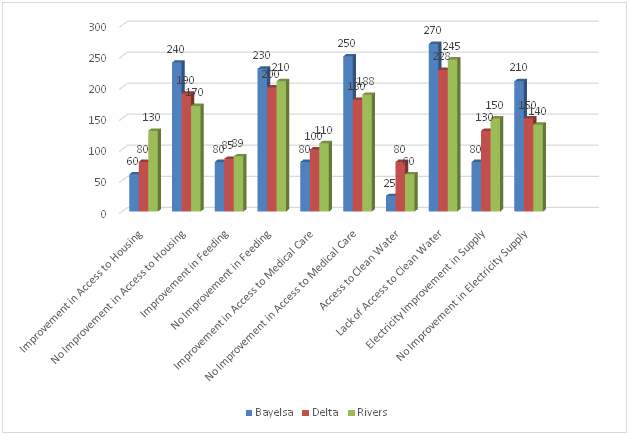 In this regard, the Figure 8 are significant in many ways. For examples, the absence of decent accommodation is a measure of poverty. Equally, poverty gives rise to a situation where people cannot afford adequate food. This is also true of the lack of or inadequate access to medical services. Related to this is the lack of clean water, which compounds health problems with the attendant effects on productivity, especially in this current pandemic of COVID-19. As one billion people currently living in slums in poor countries lack the most basic necessities, such as toilets, handwashing facilities, space and access to medical care. They will be at the epicentre of the coronavirus disaster. Also, as the global COVID-19 pandemic escalates and tightens its grip, the need for affordable housing at scale is more urgent than ever, not only for this emergency but also for preventing future pandemics from tearing through poor urban communities and to resuscitate economies decimated by the disease.Equally, as water is at the heart of sustainable development and has proven to enhance social wellbeing improvements, affecting billions of lives. The services of water resources and variety that is offered, underpin reduction in poverty, economic development and environmental sustainability.The UNDP (2006) reported that only about 24% of the rural population and half of the urban population, especiallyin the Niger Delta have access to potable water. This agrees with the findings of a poverty baseline survey conducted by the Bayelsa State Micro Credit Administration Agency, which revealed that only an infinitesimal proportion of the rural populace have access to potable water (see Figures 5&6 above). However, on the supply of potable water, respondents were of the opinion that the supply of potable water has not improved, thereby making it’s clear that a global response that requires staying at home, handwashing with soap and water and social distancing simply will be difficult to practice for those people currently living in inadequate shelter. At present only one in five slum residents in urban Africa have access to clean and safe water, this is also true of the provision of health facilities, which respondents insist has not improved in all the three states and with increasing COVID-19 caseloads, many health care systems will be stretched beyond capacity and knowing fully well that one of the global worst health care structures may well be found in Nigeria and the ratio of doctor-patient is about 1:1000.2This agrees with the earlier findings on limited access to social amenities noted above in the discourse on poverty.Today there is a deficit of 50 million houses in Africa and 70 million in South Asia and 300 million new homes will be needed by 2030. Affordable housing is one of humanity’s greatest challenges and has long been side-lined but is the most comprehensive and sustainable humanitarian response we have in the face of the recent pandemic and future public health catastrophes. Investing in the widespread construction of decent, affordable housing needs to be a top priority now more than ever as it is a foundational part of any post-corona economic recovery plan. It’s clear that investing in affordable housing solutions delivers on many fronts including for healthcare, pandemic protection and prosperity. Creating an asset that futureproofs and builds in resilience ahead of unanticipated crisis could hold the key to solving and preventing both crises and will buffer families living in the global south against such shocks.
