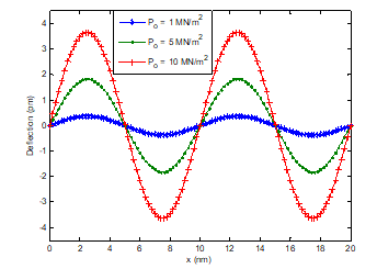 Figures 4–7 depict the influence of external pressure, temperature and foundation parameter on the steady state response of the CNT. Increasing external pressure results in a corresponding increase in the deflection of the CNT. When the pressure distributed at the CNT surface is converted into a resultant force, it acts at the mid-point of the nanotube span. At that point, the shearing force will be zero while bending moment will be maximum. This results in an increase in CNT deflection. Furthermore, an increase in foundation parameter and temperature have an attenuating attribute on CNT response (Figures 2–4).