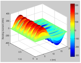 Figures 8–12 depict the multi-dimensional Shearing force and bending moment diagram of the CNT for bi-modal cases. Locations with maximum bending moments are observed to possess minimum shear force. The combination of these responses and the mode shape of the structure may be used to track location of anti-nodes for resonance prevention.