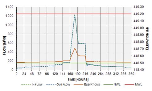 La Boca Dam spillway´s original design flood (Tr 10 000 years) corresponds to a maximum outflow of 2 250 m3/ s, on the other hand, from the hydrometric update a maximum inflow of 1 236 m3/s was obtained, leaving 1 014 m3/s at the maximum discharge capacity compared to original design. Updated flood routing simulation associated to a return period of 10 000 years by the reservoir, considering as an initial condition the elevation of the NWL (448.50 m), Figure 11 defines the maximum elevation in the reservoir is 448.71 m, this is 0.49 m below the MWL (449.20 m). The application of proposed methodology by Huerta & Domínguez1,2 reflects an average saving of 0.44 million pesos respect the conventional estimation method, however, comparing the results obtained with those of other reservoirs studied by Huerta and Domínguez, (El Cuchillo and Cerro Prieto Dams, Figures 10 and 11, respectively), the savings obtained from simulation are minimum. Table 7 shows the comparative summary of results obtained. As can be seen in the Table 7, the savings reflected for El Cuchillo (31%) and Cerro Prieto (54%) dams are highly significant compared to those obtained for La Boca Dam (9%). Therefore, it is possible to define that the methodology proposed by Huerta and Domínguez generates optimal results in reservoirs whose downstream border are not a plain area, as in the cases of El Cuchillo and Cerro Prieto dams. Due to the above, the savings obtained for the La Boca dam are minimal, however, the methodology optimizes the operation of the reservoir, guaranteeing the flow committed or demanded, safeguarding the reservoir elevation before an a extraordinary flood event.37,38
