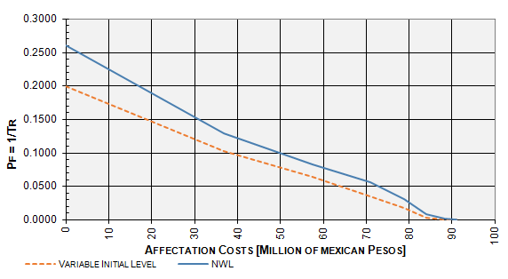 Based on costs per affected hectare at Chicoasén II Hydroelectric Project (90,090 Mexican pesos in 2014), it was considered to use a slight increase in the average inflation rate of 1% by 2015 (as the same way that El Chuchillo and Cerro Prieto dams), corresponding to a cost per Hectare of affectation of about 90 900 Mexican pesos; this cost was multiplied by the affected areas, determining the costs associated to different exceedance probabilities (Figure 9). The expected cost is determined as the area under the curves in Figure 10. The result is shown in Table 6, in which both scenarios are compared.36