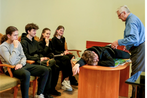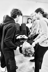 The photo shows that our classes were structured around solving situations in the event of “accidents.” In the absence of stretchers, tables and chairs were used to carry the hypothetical victims. This allowed everyone to be involved in solving the problem. In the right photo, 6 students are synchronously lifting and carrying a “victim” in the “frog pose” with a suspected pelvic bone fracture. He has a regular chair under his back and knees so that he doesn’t strain his abdominal muscles,