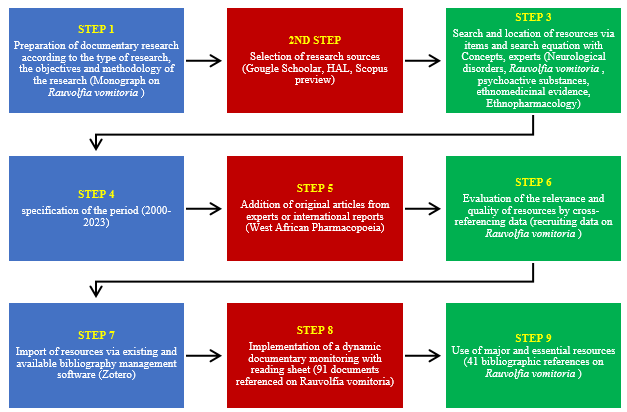 The documentary research was conducted in nine steps (preparation of a documentary search, selection of research sources, research and location of resources via items and search equation with concept or expert words, specification of the period, Addition of original articles from experts or international reports (West African Pharmacopoeia), Evaluation of the relevance and quality of resources by cross-referencing data (recruitment of data on Rauvolfia vomitoria), Import of resources via management software for existing and available bibliographies (Zotero), Implementation of dynamic documentary monitoring with reading sheet (91 documents referenced on Rauvolfia vomitoria), Use of major and essential resources (41 bibliographical references on Rauvolfia vomitoria ) following the GBEH (Large Base for a Holistic Study) method developed by Gbekley in 2021 (Figure 1). This systematic search of published articles was carried out in the Scopus and Google scholar database using the key concepts (Neurological disorders, Rauvolfia vomitoria, psychoactive substances, ethnomedicinal evidence, Ethnopharmacology). This research, carried out over the period from 2000 to 2023, was carried out with a search equation (and/keywords) with exceptions made to the references to expert documents (West African Monographs) (Figure 2). A total of 41 selected articles relate to theoretical studies, field studies, conferences, study reports and international meetings around Rauvolfia vomitoria.