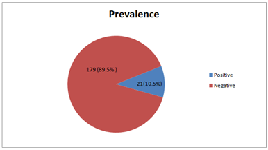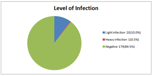 Out of 200 school children in primary school involved in this study between the ages of 5-14years, 92 were females while 108 were males. Overall prevalence of urinary schistosomiasis was 21(10.5%) (Figure 1). Light infection cases were 20(10.0%) while only one case of heavy infection found in a male (Figure 2). The male pupils 16(14.8%) were significantly more infected than 5(5.4%) female pupils (χ2=4.651, df=1, P=0.031, OR=3.026). Pupils within the age of 7-8years had more infections followed by those of 13-14 years, but there was no infection in pupils of 5-6 and 9-10years (χ2=11.144, df=4, P, 0.025) (Table 1). Among the risk factors considered, swimming (χ2=6.102, df=1, P=0.014, OR=3.578) and irrigation farming (χ25.541, df=1, P=0.019, OR=3.368) had significant associations with occurrence of urinary schistosomiasis. Pupils that involved in fishing activity were 2.105times more at risk of getting the infection than those who did not. Considering the source of domestic water, pupils that used wells were most infected with Schistosoma haematobium than those that either use boreholes or taps (Table 2).