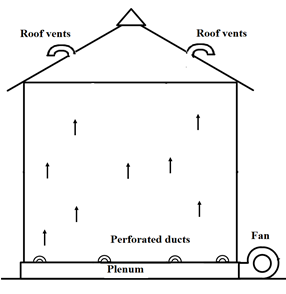 Aeration can be defined as the forced movement of ambient or chilled air with suitable quality through a grain bulk for improving its storability.1 This method is widely used to preserve the physical conditions of the stored grain, and is considered one of the most important practices of the postharvest sector in terms of food security.2 The basic components of an aeration system are the storage unit with a fully or partially perforated false floor (or with perforated ducts), a fan and roof vents to intake or exhaust of the air.3 Either pressure or suction airflow could be used in most grain storage structures, with pressure systems being most popular since they result in more uniform airflow distribution.5 Pressure airflow is also required when loading warm grain on top of bulk already cooled, allowing the aeration even when air humidity is high, since ambient air is heated after passing through the fan, reducing the relative humidity of air entering the grain mass. Additionally, pressure aeration systems are recommended in regions where storage roof vents can become iced over because of freezing rain or heavy snow, minimizing the risk of roof collapse.1 In the pressure aeration systems, fans are connected to the plenum or duct system, and air is blown upward through the grain at relatively low rates.3