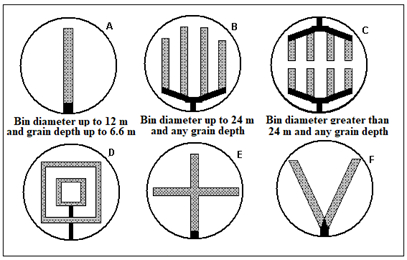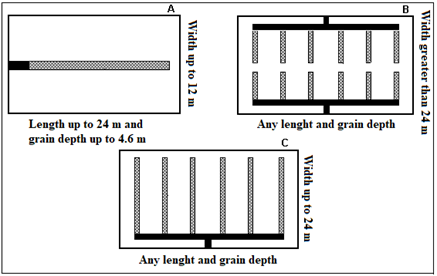 Different layouts can be used when installing the ducts of an aeration system. Aeration ducts in flat storages are usually aligned across the facility, allowing easier control of airflow into the grain5,7 (Figure 2). For flat-bottom bins there are several options for air distribution systems (Figure 3), with parallel ducts (Figure 3A, 3B and 3C) appearing as the most common and differing only in their size and spacing.1,7 Hopper-bottom bins, semi-V, V and W-bottom flat facilities normally use perforated ducts running up and down the sloped surface (Figure 4A), but it is also possible to employ radial-type ducts (Figure 4B).