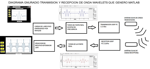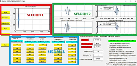 Using Matlab, the signals are generated, which are saved in the files on the computer. Then the stored file corresponding to the signal to be transmitted is loaded by GNU radio for transmission through the USRPB210. Then it goes through the object that is buried and the information obtained is stored to deliver it again to Matlab for the respective processing. The wavelet signal to be transmitted is initially generated in Matlab® from its mathematical equations, which is received by the GNU Radio software through a file. In the same way, the information received by GNU Radio (reflected signal) is delivered in a file to Matlab for further analysis. To facilitate the selection of the wavelet wave, define its conditions and generate the base signal to be transmitted, the Matlab Guide application was used, whose graphic format facilitates interaction with the user. Figure 3 shows the designed interface.