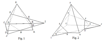 Example 1: With the Geospac W program, after using its functions to draw the face of the pyramid S.ABCD and the plan (MNP) with P, M, N being the midpoints of segments SC, AB, AD respectively (Figure 1) (Figure 2), we easily used the “turn” commands for all the geometrical subjects so that from the position in we switched to the position in Figure 2 to help the students visualize the shape in a better way. With using the “turn” commands the structure of the shape does not change but the students will observe the elements of the given math problem more thoroughly and exactly. Therefore, the program will help the students overcome the issue of drawing the shape incorrectly and will help them understand the typical properties of the drawn shape (to avoid the mistake that the particular features of the drawn shape are the general features of the shape) and also enhancing the ability picturing the space (problems such as dashed lines and continuous lines in the shape; the issue of choosing the best angle of view so that the best visualization is achieved).