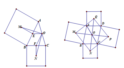 Example 2: Consider math problem 1: Given edges AB, BC of triangle ABC and outside of triangle ABC there are two squares (AB and BC are edges of the squares) with their centers M and N, respectively. With O as the midpoint of segment AC. Prove that triangle OMN is a right-isosceles triangle at O. In the math problem above, the student can easily find the solution as follows: Take E, F as the midpoints of segments AB and BC respectively (Figure 3) (Figure 4). Therefore. From that we deduce,,. And because FO//AB, we deduce. From that we can deduce that. We get DOMN is a right-isosceles triangle at O. Based on math problem 1, we use the functions of the program to create new squares that are symmetrical to the squares that have the centers M and N respectively and that go through point O of segment AC. Take P, Q as centers of these new squares. Now, we have triangles OMN, OPQ that are right-isosceles triangles at O and symmetrical to each other. Because of that we have P, Q as points of symmetry with respect to M, N, so MNPQ is a square. From that we can proceed to problem 2 below: