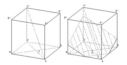 Example 3: Given parallelepiped ABCDA’B’C’D’. Take point I on segment AB. Determine the face created by the parallelepiped and plane (α) that goes through I and is parallel with BD and AC’. In order to help the students solve this problem, the teacher can introduce the GeospacW program as explained below: