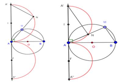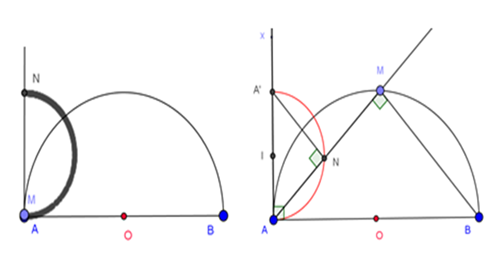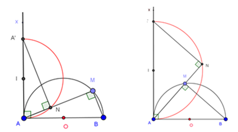 Draw ray Ax that makes a right angle with AB as drawn in Figure 16. On ray Ax, take point A’ so that AA’ = AB. Therefore, we have A and A’ fixed. Because AN = BM, AA’ = AB and triangles A’AN = ABM, it means ABM ~A’AN We deduce that = = 90o. Therefore, N is on the semicircle with diameter AA’. Because M is moving on the semicircle with diameter AB, ray AM is limited by rays AB and Ax. Because of that, N Î AM only move on semicircle with diameter AA’ which belongs to the plane with AB, which contains the given semicircle. So the locus of point N is semicircle with diameter AA’ which belongs to the plane with AB, which contains the given semicircle (Figure 16) (Figure 17).