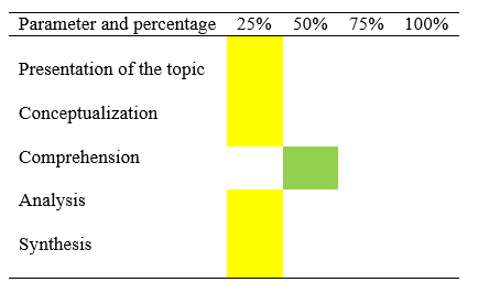 Continuous evaluation was made on the written products, from planning to their final presentation, against the vision of evaluating the products until they reach their completion, generally through an exam. Evaluation is considered to be a constant exercise to identify what has been done to achieve the proposed goals, based on performance indicators and expected learning, as well as what remains to be done, the achievements obtained, the difficulties and obstacles encountered by the students, all of which allows feedback.