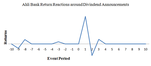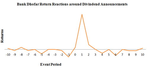Table 1 shows the abnormal return of Ahli Bank around the dividend announcement. The study consider 11 days event window comprising 5 days prior to annual dividend announcement and 5 days post annual dividend announcement. There is no positive abnormal return found in pre-announcement period. The abnormal return is found in the post announcement period, very next day of dividend announcement; 7% positive abnormal return was recorded. The second day of the dividend announcement -3% negative abnormal returns was recorded in the Ahli Bank. A little abnormal return is found during the first two days after the announcement of dividend results. After that abnormal return is reduced. The t-test statistic value for abnormal return and cumulative abnormal returns has statically significant on the post event period (0, 1 and 2 days) at 5% levels; which leads to rejection of the null hypothesis. The cumulative abnormal return for the event period is -1%. R-squared value indicates the percentage of the Ahli banks stock price return movements that could be explained by price return movements of MSM 30 index. Figure 1 graphs shows return of Ahli bank around the event period; in which there is no appears of general trend. The trading strategy is only viable if the nature surprise is known and most noticeable movement is the return of Ahli bank rises considerably on the 1st day of post announcement period for a positive surprise. Table 2 shows the abnormal return of Bank Dhofar around the dividend announcement. The study consider 11 days event window comprising 5 days prior to annual dividend announcement and 5 days post annual dividend announcement. There are negative abnormal returns found in pre-announcement period. In the post announcement period, very next day of dividend announcement; 12% positive abnormal return was recorded. The second day of the dividend announcement 2% positive abnormal returns was recorded in the Bank Dhofar. A considerable abnormal return is found during the first two days after the announcement of dividend results. After that abnormal return is reduced and 6th day of post announcement negative abnormal return is recorded. The t-test statistic value for abnormal return and cumulative abnormal returns has statically significant on the pre and post event period at 5% levels; which leads to rejection of the null hypothesis. The cumulative abnormal return for the event period is -1%. R-squared value indicates the 36 % of the Bank Dhofar stock price return movements that could be explained by price return movements of MSM 30 index.5