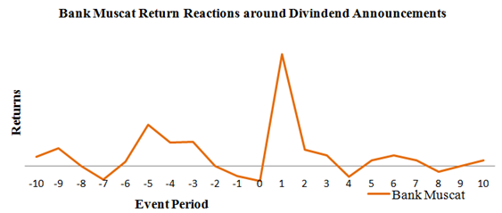 There is 4% positive abnormal returns found in pre-announcement period (4 days prior to the event). In the post announcement period, very next day of dividend announcement; only 8% positive abnormal return was recorded but on the second day of the dividend announcement 1% positive abnormal returns was recorded in the Bank Muscat The t-test statistic value for abnormal return and cumulative abnormal returns has statically significant on the pre and post event period at 5% levels; which leads to rejection of the null hypothesis.14–17