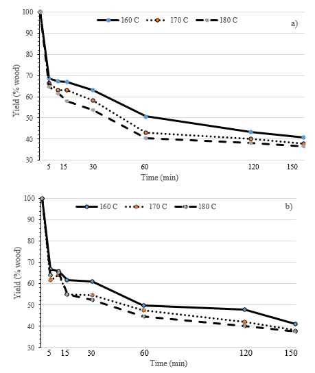 Figure 1 Pulp yield versus time for kraft pulping of Acacia aulacocarpa original (a) and extracted heartwood (b) at 160, 170, and 180°C.