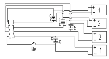 4. The second pair of electrodes connected to the second capacitors battery (parameters of all capacitors batteries are identical);