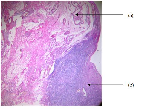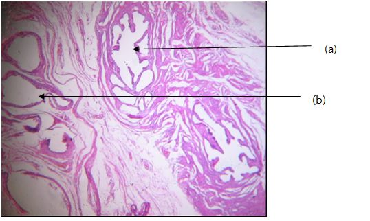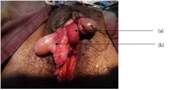 It was an individual who has 15-year-old, declared a female gender at birth. On physical examination, female-type secondary sexual characteristics were normal, including well-developed mammary glands, triangular pubic hairiness, and a regular endometrial cycle since one year before the diagnosis. The external genital tracts, showed sexual ambiguity (Figure 1) with a normal hymen, a vaginal vestibule, small and large hypotrophy lips, and a hypertrophy clitoris taking the appearance of a penis measuring 2.5cm. The labioscrotal (para-clitoral) region contained a scrotum within which an ovoid, mobile mass, the size of a normal testicle, was palpated. For the internal genital tracts, pelvic ultrasound showed a deviated uterus on the left and a left ovary, both normal. Surgery was decided and consisted of excision of the intrascotal mass, followed by vaginoplasty and enlargement associated with a clitoral reduction plasty (Figure 2). Macroscopically, the mass looked like a normal testicle capped by the epididymis (Figure 3). On histological examination (Figure 4), coexistence of ovarian parenchyma with ovarian follicles at different stages of maturation, and testicular with seminiferous tubules associated with hyperplastic Leydig cells were observed. Both parenchymas are separated by a connective thin stroma. Epididymal and vas deferens ducts were normal (Figure 5). Following treatment consisted of a vaginal calibration with candles every week after the healing of the surgical wound. The patient was lost sight of after 3 calibration sessions.