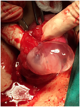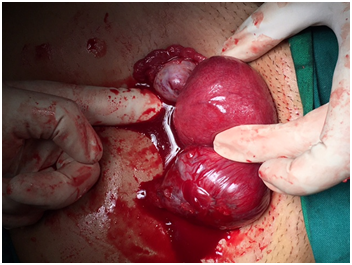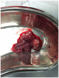 A 28 year old pima gravida presented with an episode of acute abdominal pain following 10+4 weeks amenorrhea to our accidental emergency, on examination her general conditions and vitals were well within normal limits with mild pallor. On pervaginal examination a mass of around 8 weeks was found in the right fornix with mild cervical motion tenderness when the cervix was pushed to the left side. An abdominal ultrasound revealed an empty uterine cavity and right live cornual pregnancy, with CRL corresponding to 10+2 weeks of gestation. Patient was posted and taken up for an emergency laparotomy. Intra op findings right cornual pregnancy with impending rapture (Figure 1 & 2). We performed the right cornual resection with right salpingectomy (Figure 3). Post operatively the patient was stable and discharged on the third postoperative day without any complication.