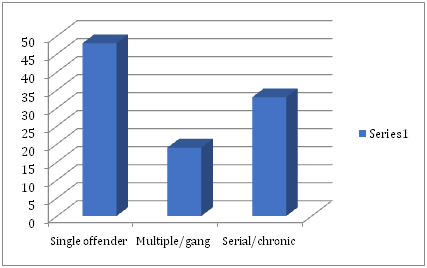 The majority 294 (48%) of violent incidents were committed by a single offender, and 116 (19%) cases were committed by multiple offenders. One-third of cases were the result of chronic abuse (Figure 1).