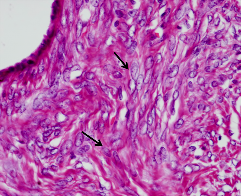 Figure 1 Granulosa cells with ovoid nuclei and occasional nuclear grooves (arrows). Columnar mucinous epithelium in left upper corner.